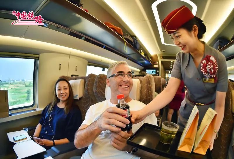 下圖:2018年,高鐵乘務員在復興號上服務。
