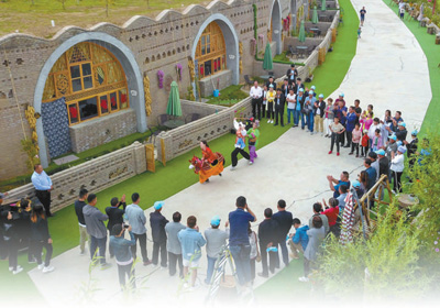 西吉縣吉強鎮龍王壩村脆弱的生態環境逐步修復。圖為游客在觀看社火表演。