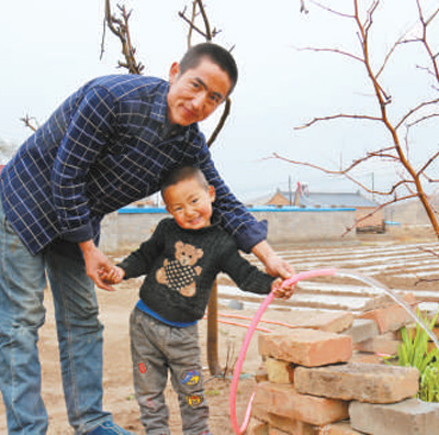 36歲的西吉縣興平鄉團結村村民王五旦和兒子展示自來水。