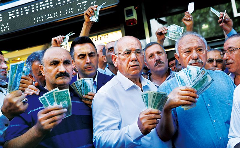 2018年,由于美聯儲加息導致國際游資大規模回流,美國對土耳其、伊朗進行制裁以及貿易保護主義的影響,俄羅斯、阿根廷、土耳其、南非等不少經濟體貨幣遭遇大幅貶值。圖為2018年8月14日,在土耳其首都安卡拉,人們響應政府號召,手持美元站在貨幣兌換處前,出售手中的美元支持本國貨幣里拉。 新華社/路透