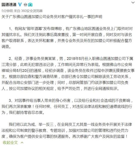 近日,有網友“卿年酒冪”發布微博稱,有廣東佛山地區圓通業務員上門取件時對其騷擾非禮。我們關注到此事后高度重視,第一時間開展自查,同時及時與該名客戶取得聯系,表達關懷和歉意,并責令業務員及所在的加盟公司積極配合警方調查。