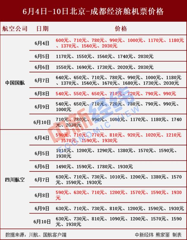 以北京至成都經濟艙為例,6月4日-10日期間,中國國航的最高票價為6月6日的2030元(以下價格均不含稅費及燃油費),最低票價為6月8日的540元,票價落差1490元。其中,6月4日的單程票價落差最大,為1430元;6月8日的票價落差最小,為450元。