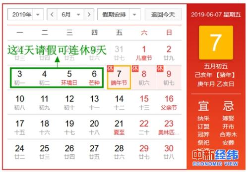 今年端午節放假時間為6月7日至9日三天,巧妙采用“拼假”--只要能在6月3日-6日請假4天,端午節便可連休9天。