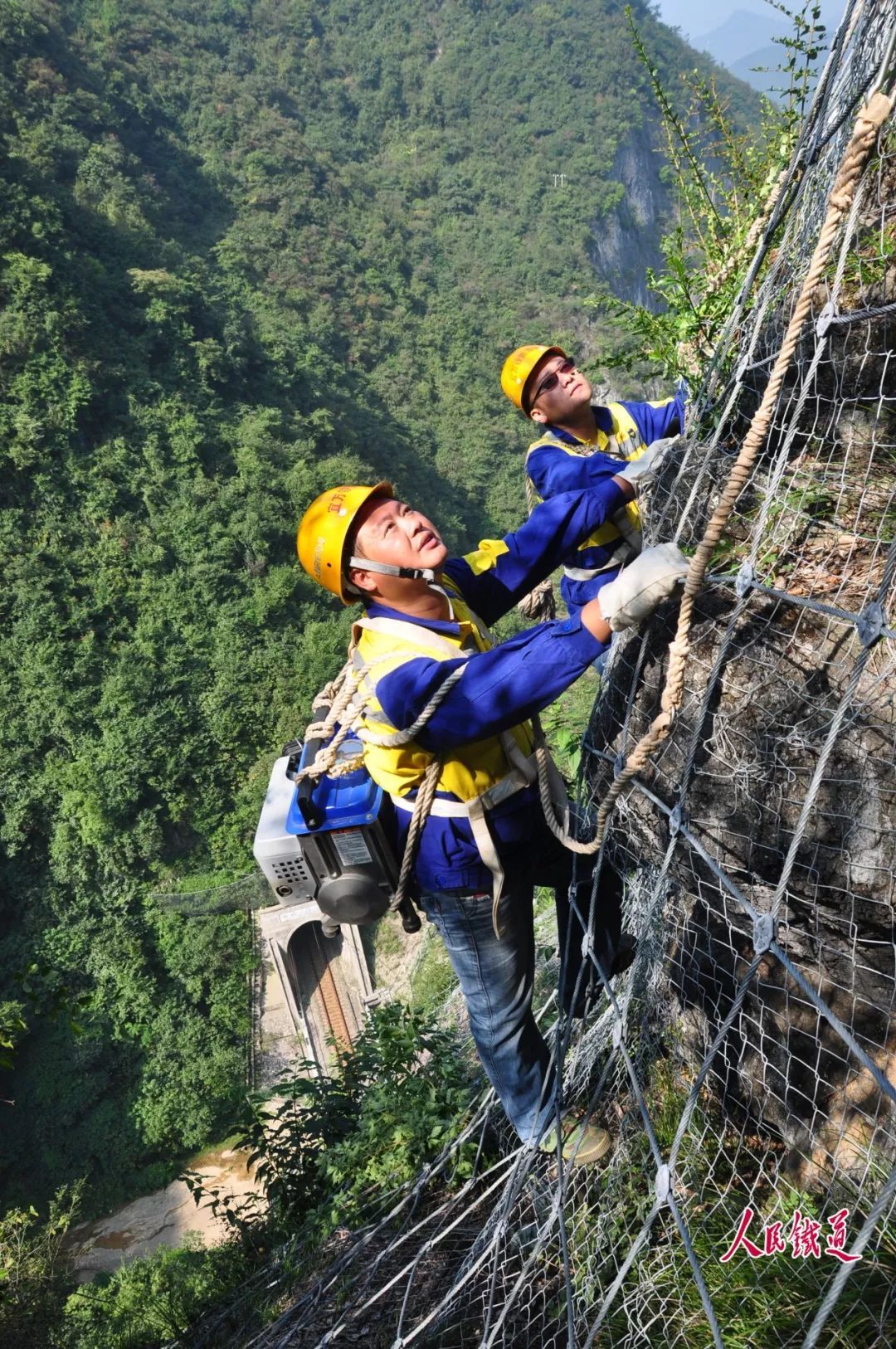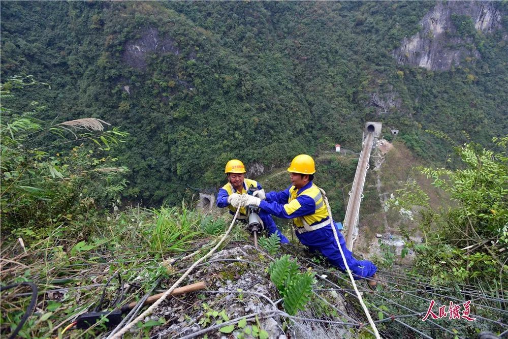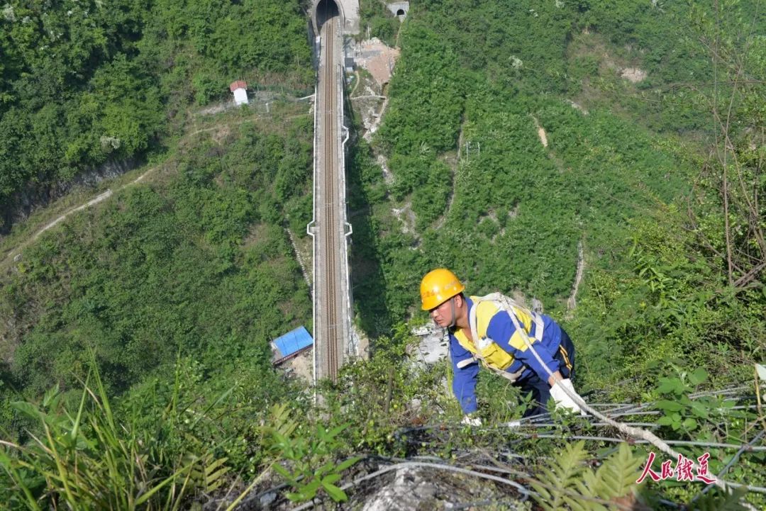 5月的武陵山區(qū),綠樹成蔭,鳥語花香,山腳下的宜萬鐵路猶如一條長龍蜿蜒,一列列動車組穿山洞、越山谷呼嘯而過,一個個黃色身影在懸崖峭壁間披荊斬棘、矯健攀爬,縛住可能松動脫落的危石,確保鐵路運輸安全暢通。