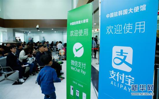 在韓國(guó)首爾,中國(guó)駐韓國(guó)大使館在領(lǐng)事辦證大廳擺放易拉寶,推介移動(dòng)支付服務(wù)。新華社記者王婧嬙攝