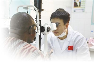 第十七批援塞內加爾醫療隊隊員正在給當地患者檢查眼睛。