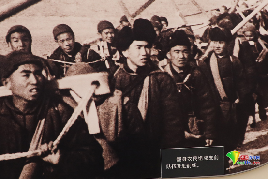 翻身農民組成支前隊伍開赴前線。中國青年網記者 曾繁華 翻拍自西柏坡紀念館