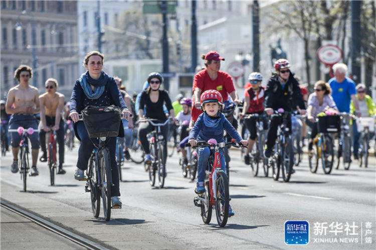↑這是2019年3月31日,在奧地利維也納,自行車愛好者參加2019自行車騎行嘉年華活動。新華社記者 郭晨 攝