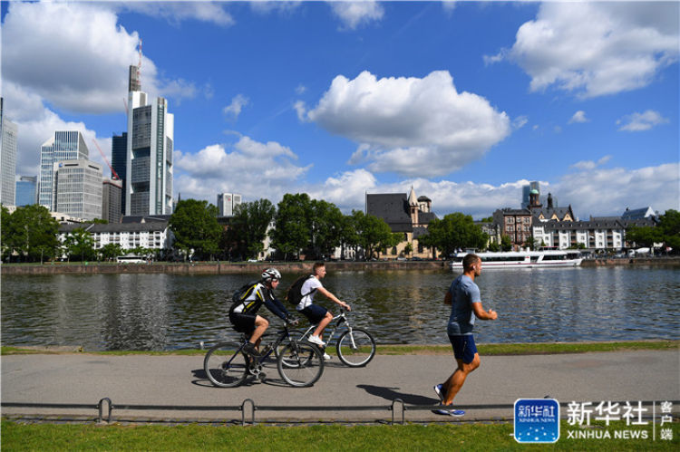 ↑這是2019年5月31日,在德國法蘭克福,人們在美因河畔休閑健身。新華社記者 逯陽 攝