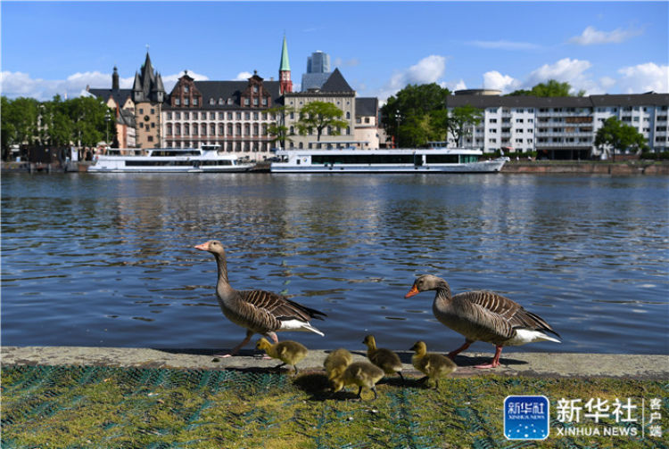 ↑這是2019年5月31日,在德國法蘭克福,灰雁在美因河畔踱步覓食。新華社記者 逯陽 攝