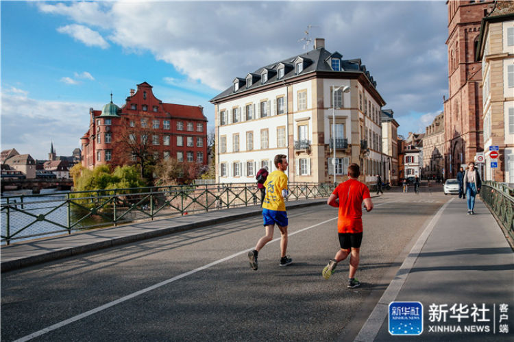 ↑這是2019年3月26日,在法國斯特拉斯堡,兩名男子在街頭跑步鍛煉。新華社記者 張鋮 攝