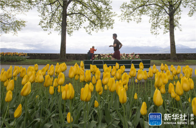 ↑這是2019年4月28日,在瑞士萊蒙湖畔小鎮莫爾日,一名男子在郁金香盛開的湖畔跑步。新華社記者 徐金泉 攝