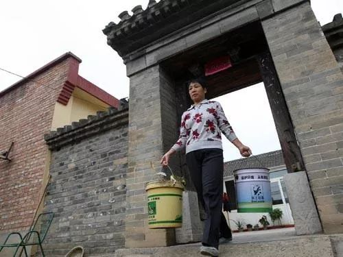 在北京順義馬坡鎮石家營村,家家門口外墻上設置有45升(廚余+其他2個桶)的分類垃圾桶。