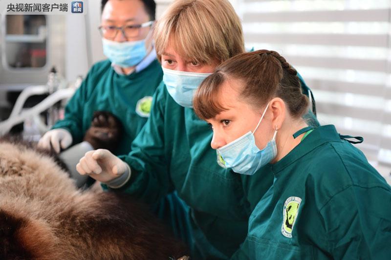 △莫斯科動物園獸醫和飼養員在四川大熊貓繁育基地現場觀摩學習大熊貓體檢。(央視記者鄭波提供)