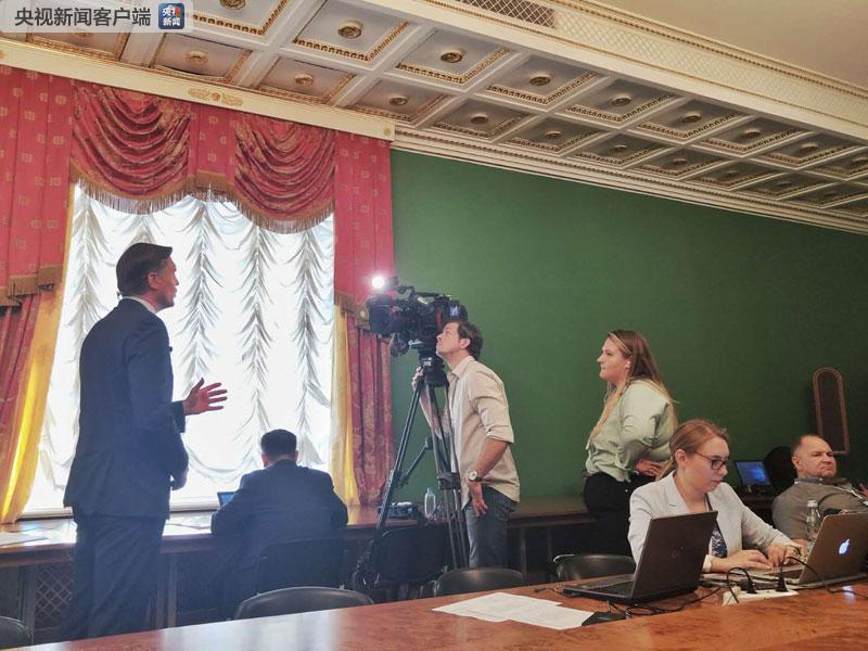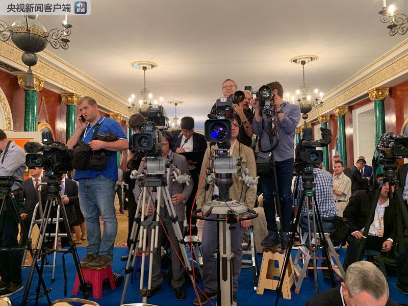 △在大克里姆林宮2層孔雀石廳,記者正在等待簽字儀式開始。(央視記者王鵬飛拍攝)