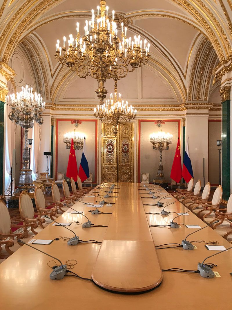 △中俄雙方在葉卡捷琳娜廳舉行小范圍會談。葉卡捷琳娜廳是以往帝王作重大講辭的場所,以葉卡捷琳娜二世命名。(央視記者石偉明拍攝)