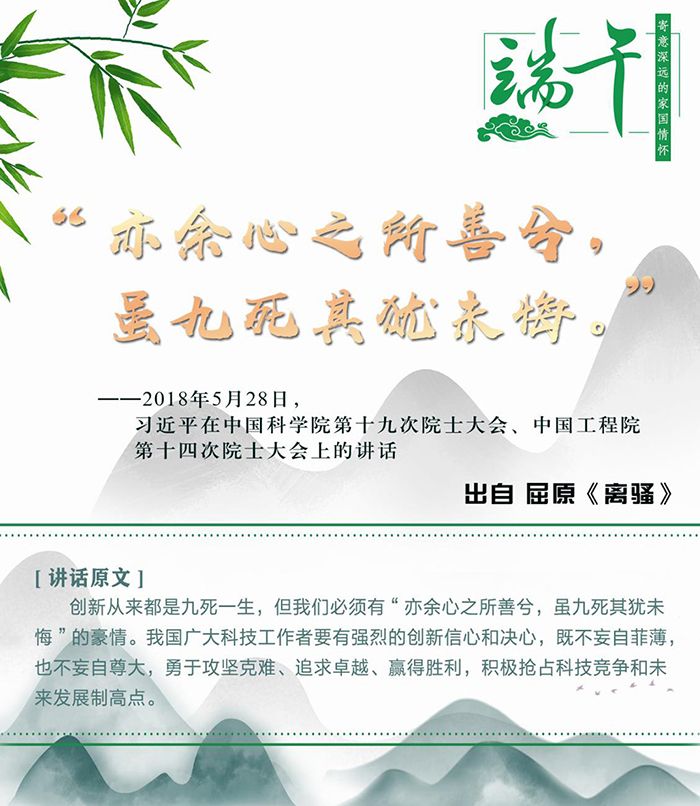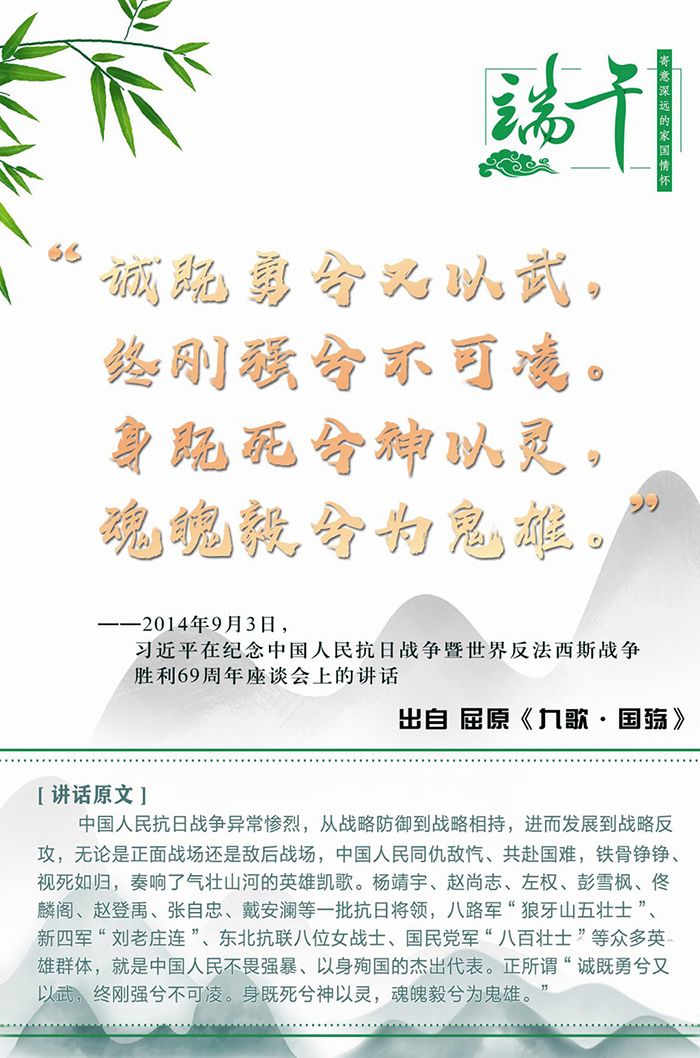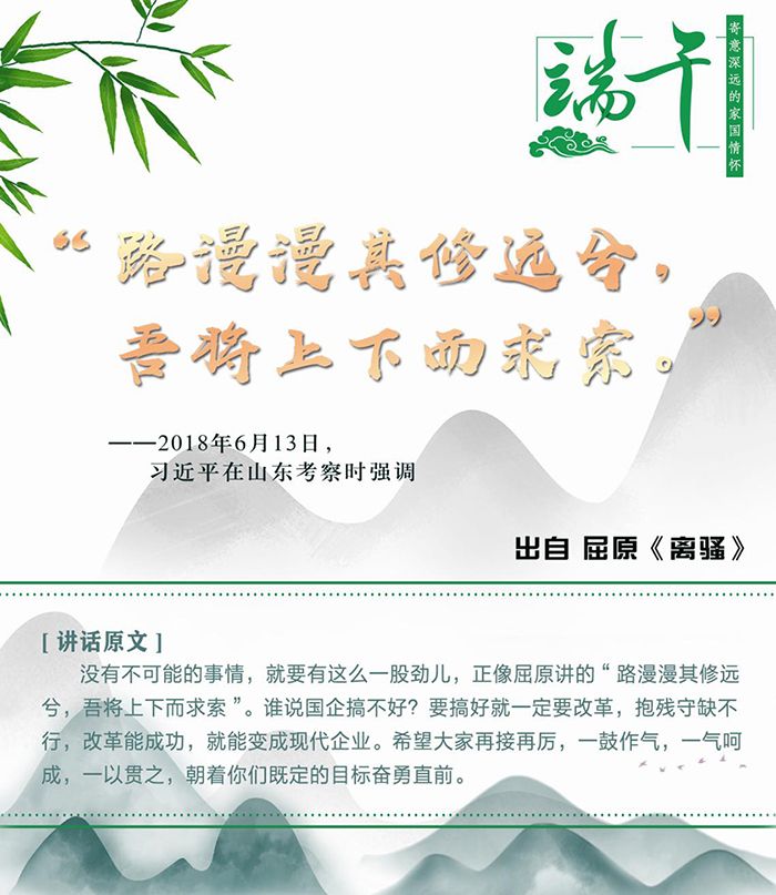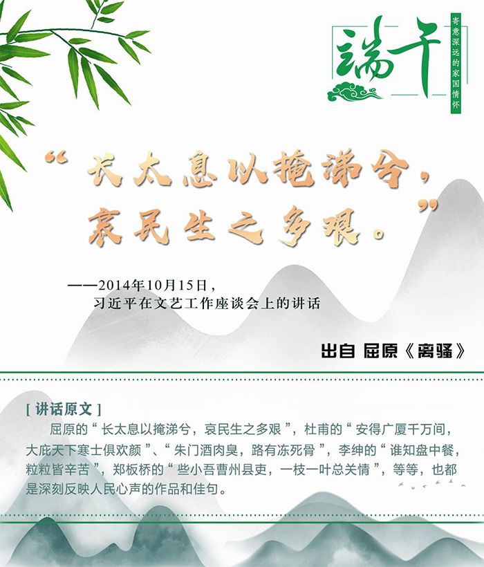 千百年來,端午節與端午文化凝結著中華民族的文化血脈和思想精華,端午二字也已成為傳承、弘揚、激發民族精神和愛國情感的載體,是有著符號意義的“根”。這一天,人們紛紛紀念屈原,在思接千古的家國情懷中積蓄前行的力量。習近平總書記曾在不同場合多次提及屈原,并引用屈原詩歌中的名句闡述思想,寄意深遠。今天,讓我們重溫習總書記平實的話語,來一場感受中華文化深厚底蘊的尋“根”之旅——去找尋古人精神與當下需求的連接點,感受中華民族傳統風骨中的愛國主義精神,思考民族精神的傳承、發展與創新。