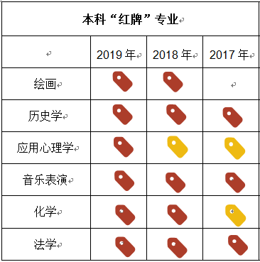 報告解釋,紅牌專業指失業量較大,就業率、薪資和就業滿意度綜合較低的專業。2019年本科就業紅牌專業包括:繪畫、歷史學、應用心理學、音樂表演、化學、法學。其中,歷史學、音樂表演、法學連續三屆紅牌。
