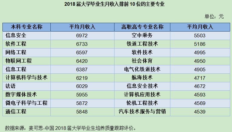 具體來看,在本科主要專業中,2018屆畢業生月收入較高的是信息安全(6972元)、軟件工程(6733元)、網絡工程(6597元)。在高職高專主要專業中,2018屆畢業生月收入較高的是空中乘務(5503元)、鐵道工程技術(5186元)、軟件技術(4995元)。