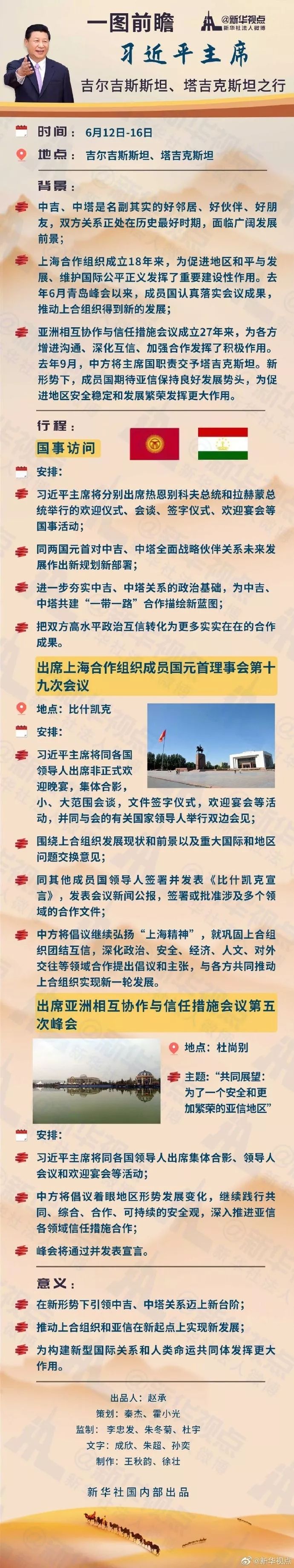 習近平主席將于6月12日至16日對吉爾吉斯斯坦、塔吉克斯坦進行國事訪問并出席在比什凱克舉行的上海合作組織成員國元首理事會第十九次會議和在杜尚別舉行的亞洲相互協作與信任措施會議第五次峰會。這次出訪有啥看點?