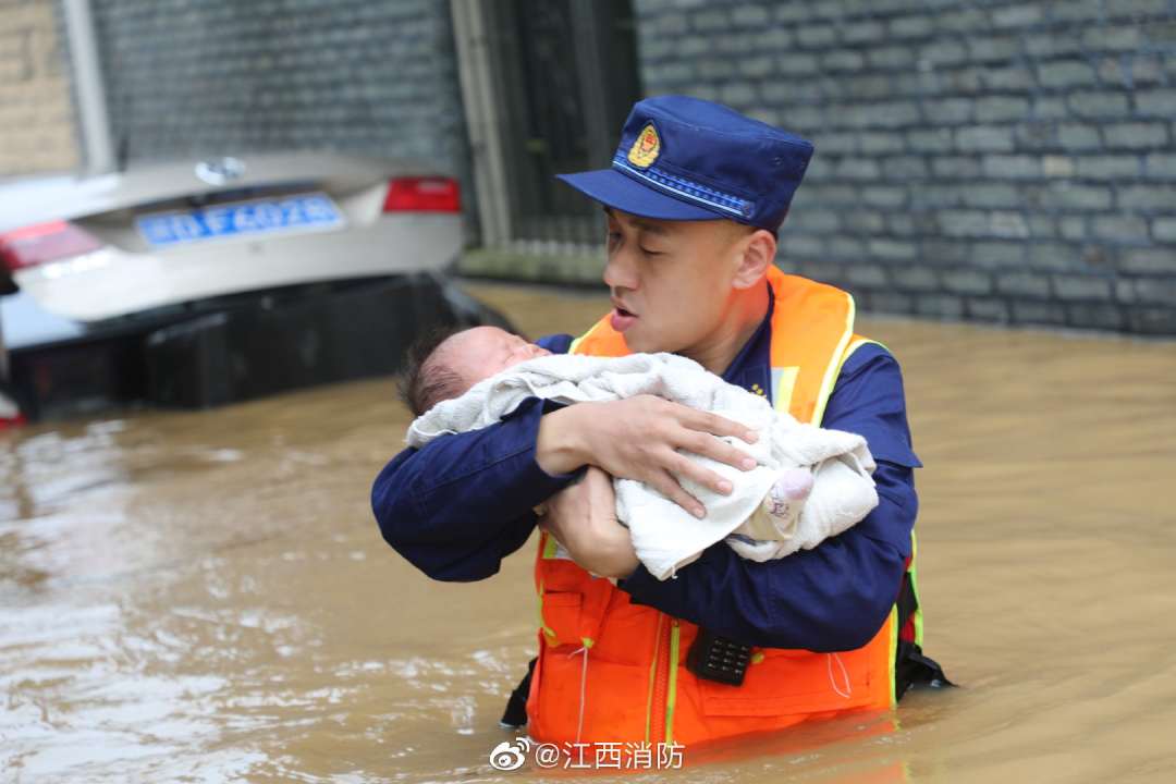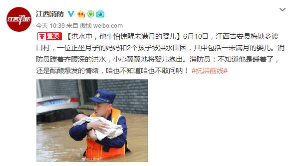 6月10日,江西吉安縣梅塘鄉渡口村,一位正坐月子的媽媽和2個孩子被洪水圍困,其中包括一未滿月的嬰兒。消防員蹚著齊腰深的洪水,小心翼翼地將嬰兒抱出。