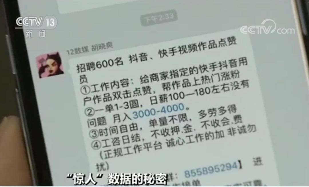 在微信和微博的聊天群里,記者也發現大量公開招募所謂點贊人員的信息。記者以應聘身份申請加入其中一個聊天群,名為“接待老師搖錢樹”的管理員簡單詢問了記者的年齡和可支配時間,就向記者發來了工作要求——為指定客戶的抖音賬號添加關注和點贊,完成即算一單,可獲得1-3元不等的報酬。單日工作量不設上限,工資也可當日結清。