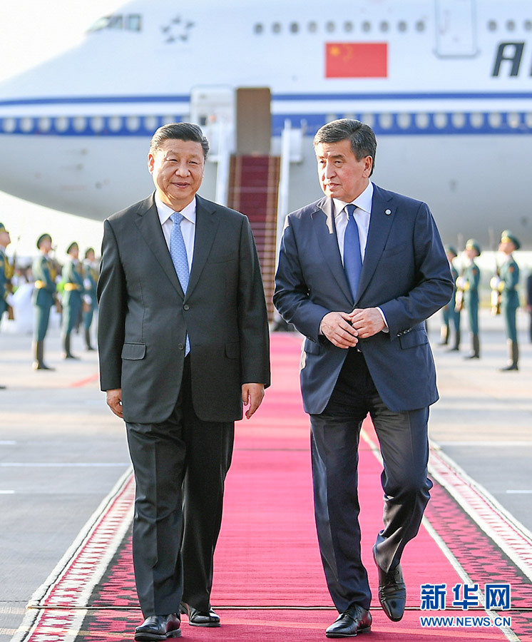 6月12日,國家主席習近平乘專機抵達比什凱克,開始對吉爾吉斯共和國進行國事訪問并出席上海合作組織成員國元首理事會第十九次會議。吉爾吉斯斯坦總統熱恩別科夫在舷梯旁熱情迎接。 新華社記者 謝環馳 攝