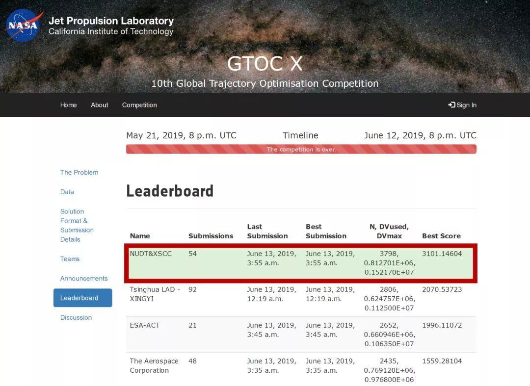 時間倒回到當天凌晨3:55分,距比賽結(jié)束僅有五分鐘,由國防科大空天科學學院羅亞中教授帶領的國防科技大學與西安衛(wèi)星測控中心聯(lián)隊(NUDT&XSCC)提交了最終結(jié)果——3101分,以絕對的優(yōu)勢摘得桂冠!