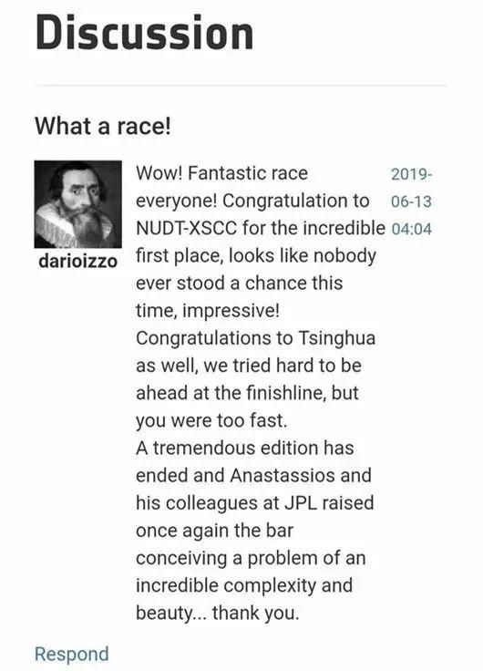 (內(nèi)容翻譯如下:wow,精彩的比賽!向不可思議的第一名NUDT-XSCC隊伍致敬,這一次他們的優(yōu)異表現(xiàn)讓其他隊伍根本毫無機會,讓人印象深刻。同樣祝賀清華大學,我們的隊伍在比賽末段非常盡力追趕,但你們實在是太快了。我們剛剛完成了非常精彩的一個版本,Anastassios和他在JPL的同事再次在這個集復雜和美學于一體的問題上更上一層樓,謝謝你們。)