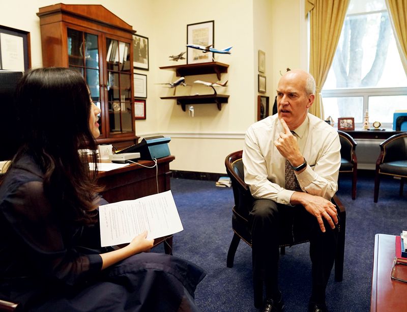 越來(lái)越多美國(guó)有識(shí)之士認(rèn)識(shí)到,美國(guó)政府加征關(guān)稅會(huì)損害美國(guó)民眾利益。圖為2019年5月9日,美國(guó)國(guó)會(huì)眾議院美中工作小組共同主席、華盛頓州民主黨聯(lián)邦眾議員里克·拉森(右)在華盛頓接受采訪時(shí)表示,美國(guó)政府對(duì)華產(chǎn)品加征關(guān)稅的做法損害美國(guó)工人與消費(fèi)者利益,不利于美國(guó)經(jīng)濟(jì),也無(wú)助于解決兩國(guó)經(jīng)貿(mào)問(wèn)題。 新華社記者 劉杰/攝