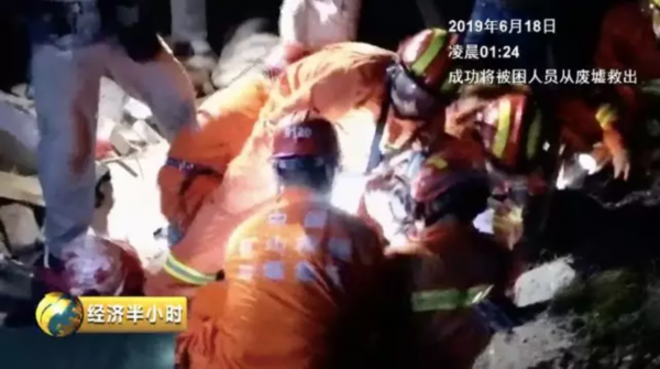 6月18日凌晨40分左右,聶光興在女孩父親的接力下,總算成功將女孩從廢墟中營救出來,消防員將她抱出了廢墟。