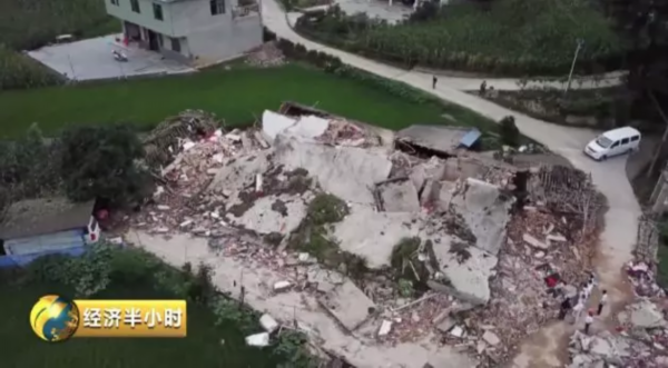 從6月18日的航拍畫面上可以看到,一處聯排的磚房由于地震,一層已經完全垮塌,被二層全部掩蓋。據當地村民介紹,這里本來有三戶人家,都是親戚。