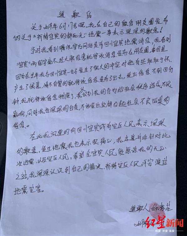 據悉,姚某妮到案后,以“姚夢菲”名義寫了一封《致歉信》。姚某妮在《致歉信》中說,她在去年與一四川宜賓女子發生了很大的沖突,對她有些耿耿于懷,產生了恨意。