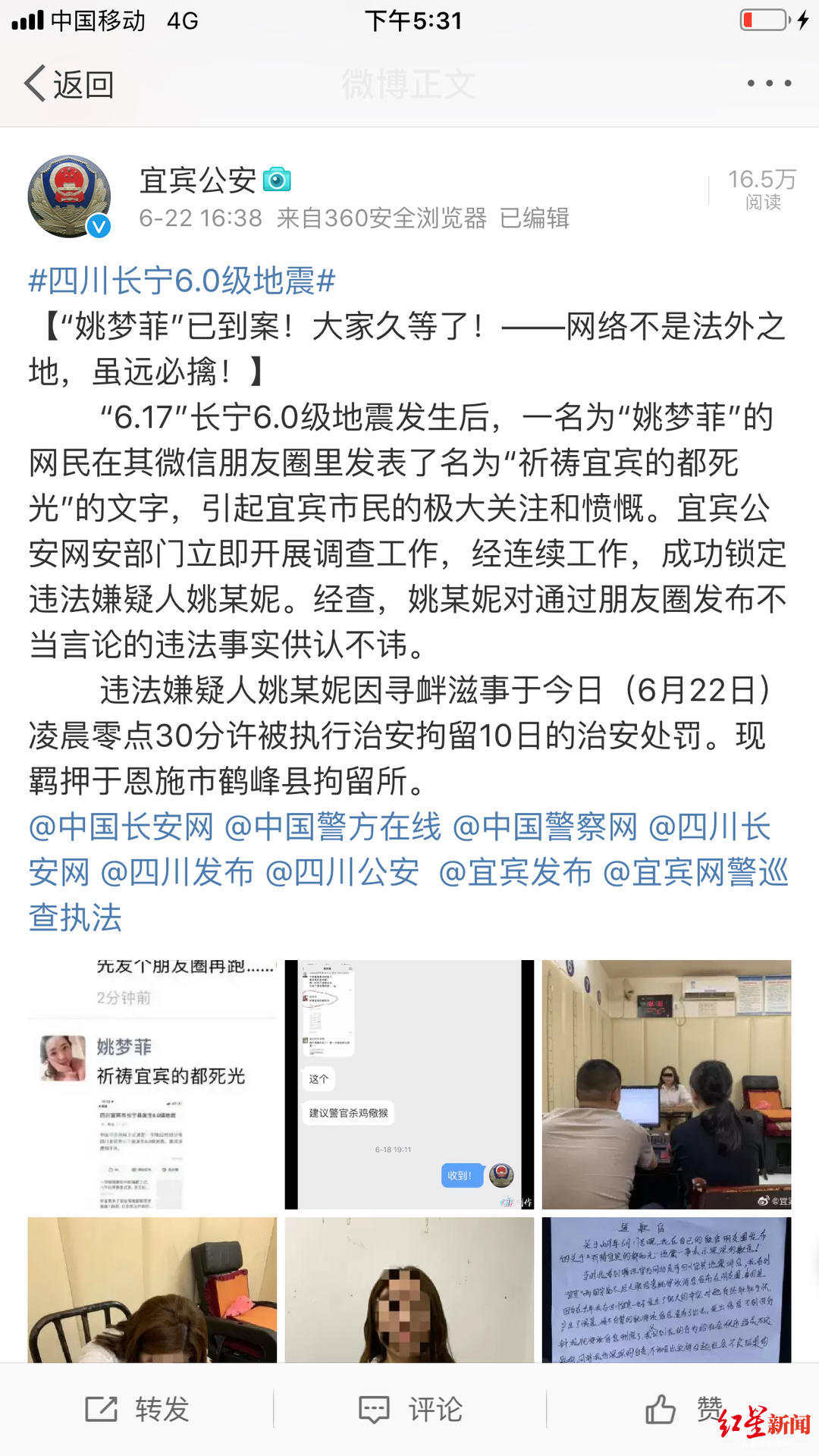 據了解,四川“6.17”長寧6.0級地震發生后,一名為“姚夢菲”的網民在其微信朋友圈里,發表了名為“祈禱宜賓的都死光”的文字,引起宜賓市民的極大關注和憤慨。