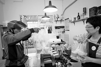 店員將通過網絡訂購的咖啡交給外賣員。新華社發