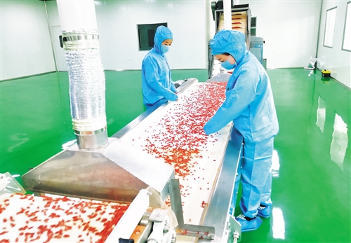 青海格爾木億林枸杞科技開發有限公司生產車間內,工作人員正在挑揀枸杞。李莎莎攝(中經視覺)經濟日報·中國經濟網記者 馬玉宏