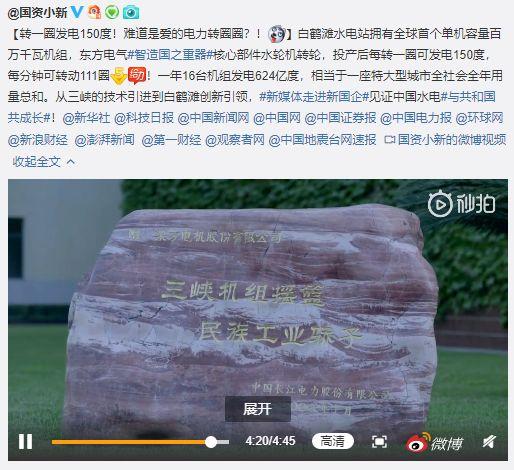 昨晚8時許,@國資小新 在微博上發(fā)了一條題為“轉(zhuǎn)一圈發(fā)電150度!難道是愛的電力轉(zhuǎn)圈圈?!”的微博,說的是白鶴灘水電站擁有全球首個單機容量百萬千瓦機組,東方電氣核心部件水輪機轉(zhuǎn)輪,投產(chǎn)后每轉(zhuǎn)一圈可發(fā)電150度,每分鐘可轉(zhuǎn)動111圈,一年16臺機組發(fā)電624億度,相當(dāng)于一座特大型城市全社會全年用量總和。↓