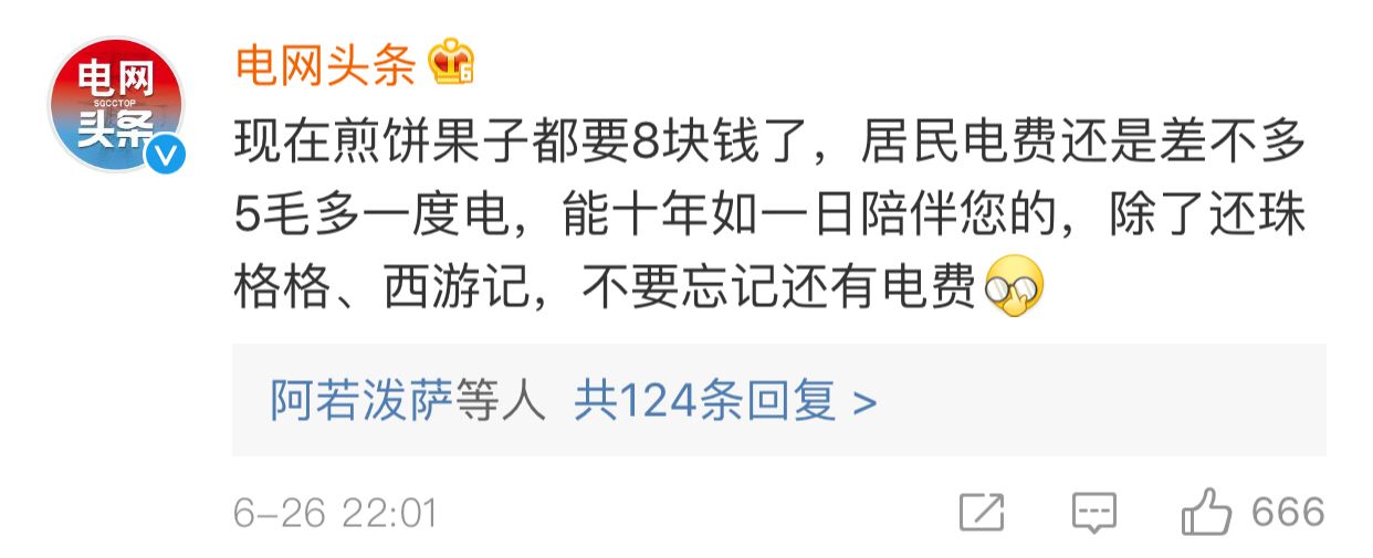 《國家電網(wǎng)報》社官方微博@電網(wǎng)頭條 的回復(fù)是:現(xiàn)在煎餅果子都要8塊錢了,居民電費還是差不多5毛多一度電,能十年如一日陪伴您的,除了還珠格格、西游記,不要忘記還有電費。