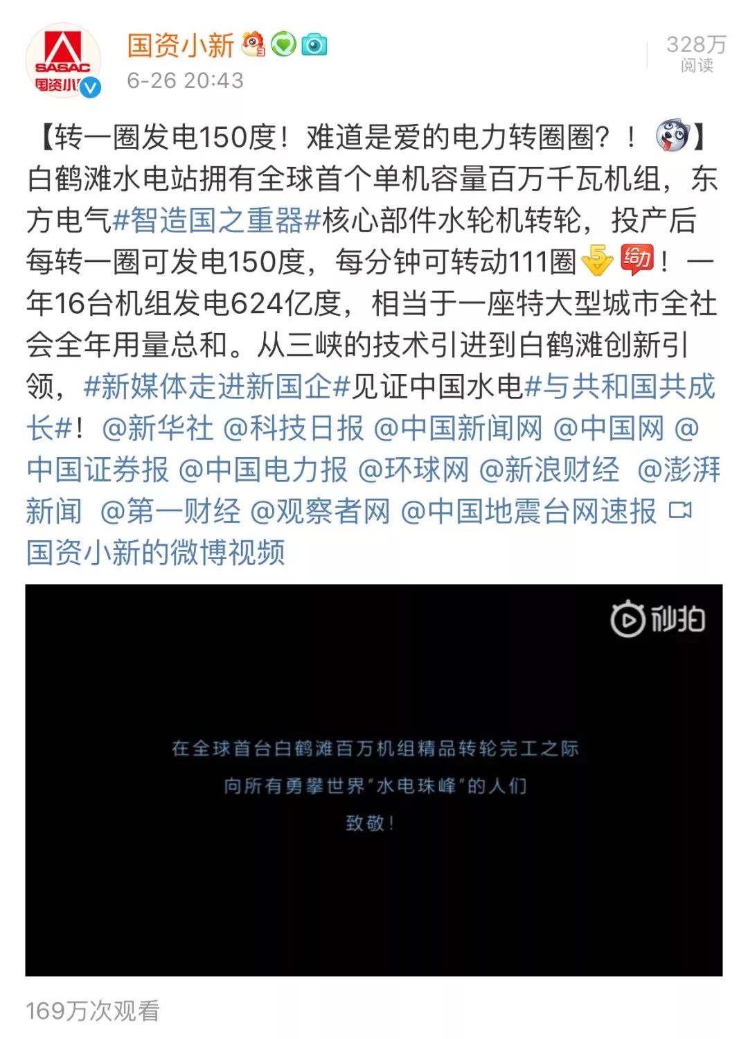 26日晚,國務院國資委新聞中心官方微博@國資小新 發(fā)了一條題為“轉一圈發(fā)電150度!難道是愛的電力轉圈圈?!”的微博,說的是白鶴灘水電站擁有全球首個單機容量百萬千瓦機組,東方電氣核心部件水輪機轉輪,投產后每轉一圈可發(fā)電150度,每分鐘可轉動111圈,一年16臺機組發(fā)電624億度,相當于一座特大型城市全社會全年用量總和。