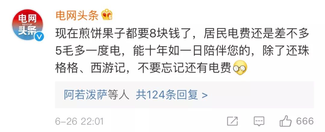 與此同時,國家電網(wǎng)及南方電網(wǎng)也前來科普。@電網(wǎng)頭條 的回復是:現(xiàn)在煎餅果子都要8塊錢了,居民電費還是差不多5毛多一度電,能十年如一日陪伴您的,除了還珠格格、西游記,不要忘記還有電費。