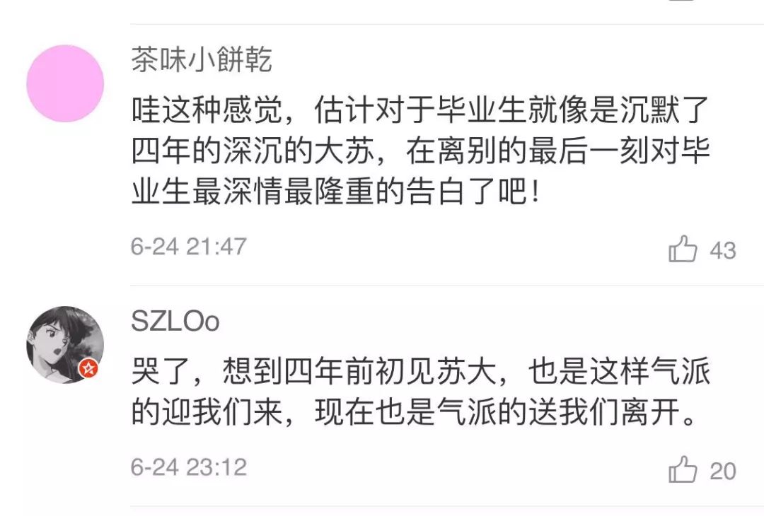 這一波硬核操作讓不少畢業生感嘆“震撼哭了”。有學生留言說,四年前初見蘇大時也是這樣氣派的迎我們來,現在也是氣派的送我們離開。