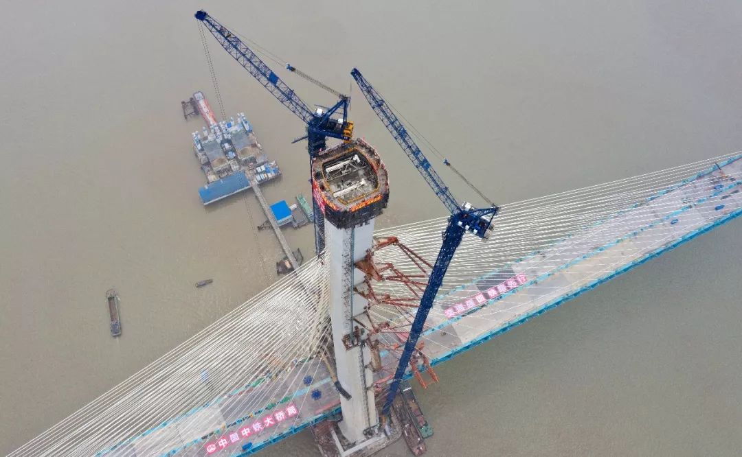 27日,滬通長江大橋南主塔順利封頂。至此,該橋兩座高達330米的主塔全部建成,標志著世界最大跨度公鐵兩用斜拉橋建設取得了關鍵性進展。