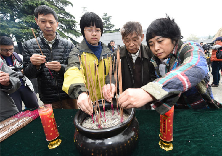 南京大屠殺幸存者常志強(右二)率親屬在侵華日軍南京大屠殺遇難同胞紀念館內的遇難者名單墻前焚香(2015年4月5日攝)。新華社記者 孫參 攝