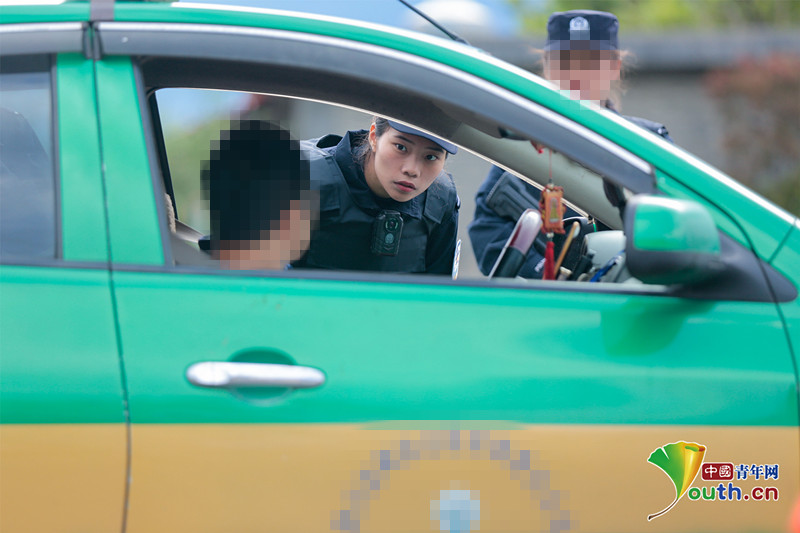 任莎莎和隊友對過往車輛進行例行檢查。 陳路坤 攝