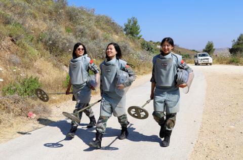 不久前,3名女掃雷手走進了真正的雷場,山高坡陡的雷區荊棘叢生,銹蝕的隔離鐵絲網、紅底白骷髏頭警示牌、偶爾可見裸露地表的地雷,時刻提醒著人們這是一片死亡地帶。