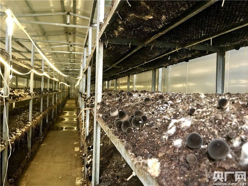 綜合體占地面積57畝,卻因為設計精巧,將空間利用率提高了五倍。18套標準工廠化食用菌房中種植草菇的菇架均為5層,菇房和辦公區的頂部也被利用起來建設光伏電板。這種設計不僅節約用地,更是每年為15個村及78戶貧困戶帶來了130萬元的光伏發電收益。村里開發了各種公益性崗位,按勞分配,將收益的70%作為報酬發放給貧困戶。