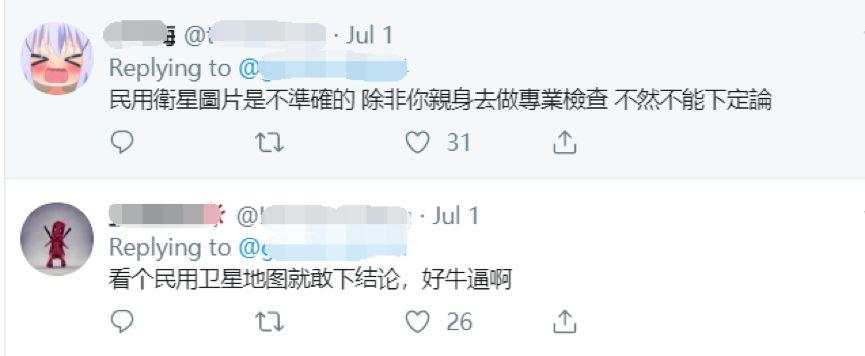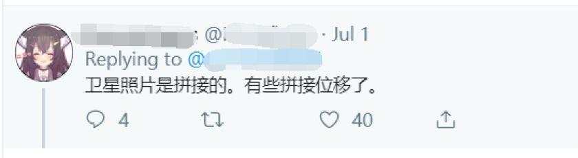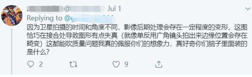 不過,這個謠言貼很快在境外就遭到了不少人的質疑。有人提出民用衛星圖片的精確度、圖片拍攝的角度和拼接成像時的算法,都會導致圖像出現變形。