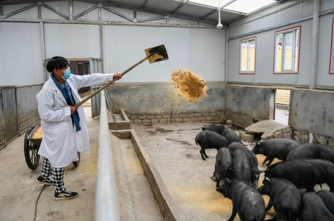 ▲西藏林芝市工布江達(dá)縣朱拉鄉(xiāng)柳四朗村藏豬擴(kuò)繁基地的工作人員桑旦頓珠在給藏豬喂飼料。新華社記者 劉東君 攝