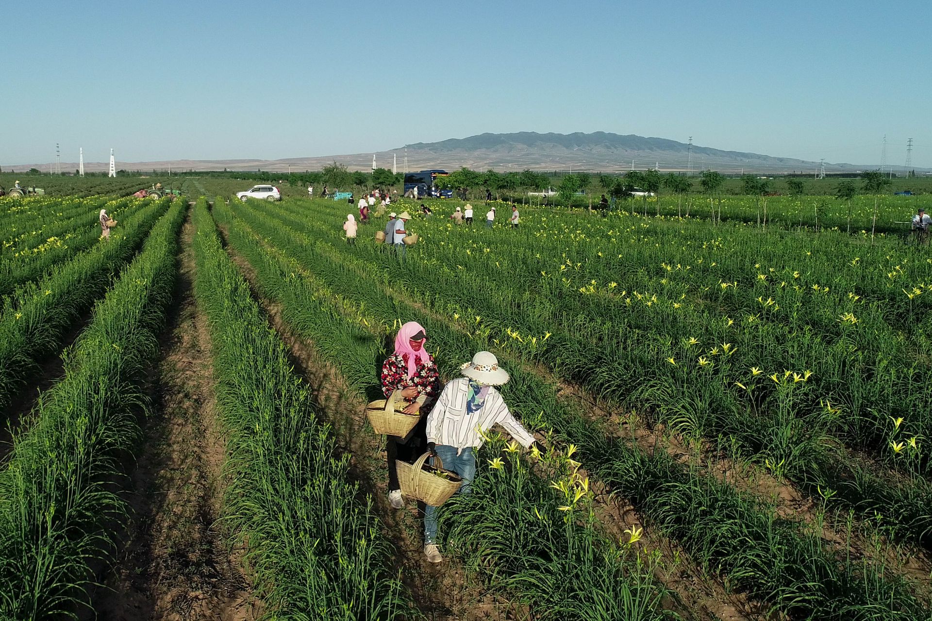 吳忠市太陽山清泉林業專業合作社負責人李志巧正在教兩名勤工儉學的孩子如何采摘黃花菜。
