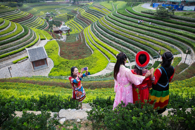 ↑7月4日,在貴州省畢節市大方縣奢香古鎮,龍恩碧(左一)給游客拍照留影。